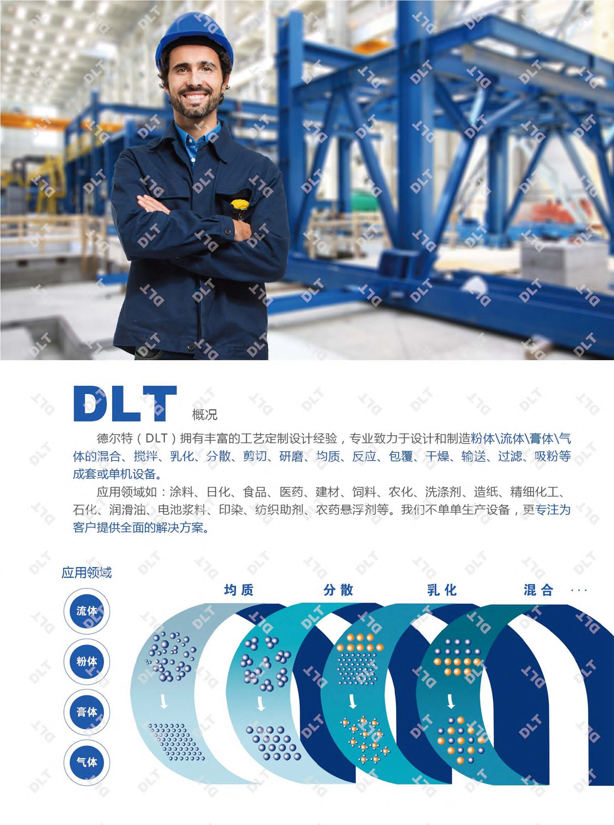 DLT全称南通德尔特混合设备有限公司,拥有丰富的工艺定制设计经验。设计生产的设备常应用在二氧化硅,重油,柴油,新材料,硅油,农药,化肥,能源,食品,制药等领域中的液体,固液,粉液,水粉,浆料,浆液,乳液,悬浮液剂,制胶打浆,捷流吸粉,结晶破碎,反应包覆等工艺中. 其产品线拥有立式,卧式,分体式,单级,三级,大中小型,卫生级,管线式,粉碎,破碎,研磨,乳化泵和可移动气动升降乳化机的设计及制造。